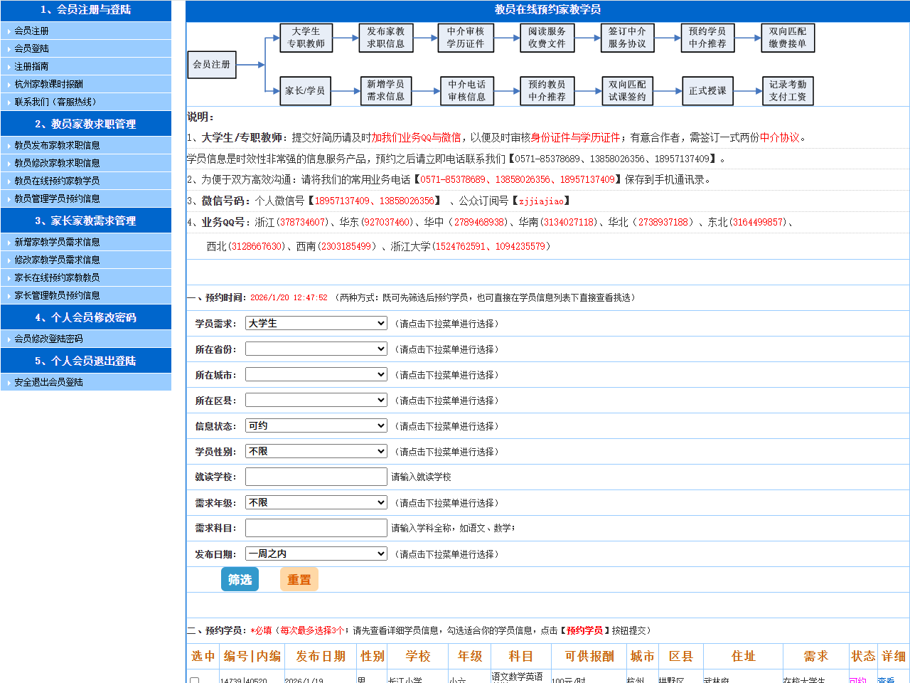 请点击左侧【教员在线预约家教学员】链接,可自行搜索或在可约学员列表里筛选预约,并请及时电话联系我们并告知学员编号;