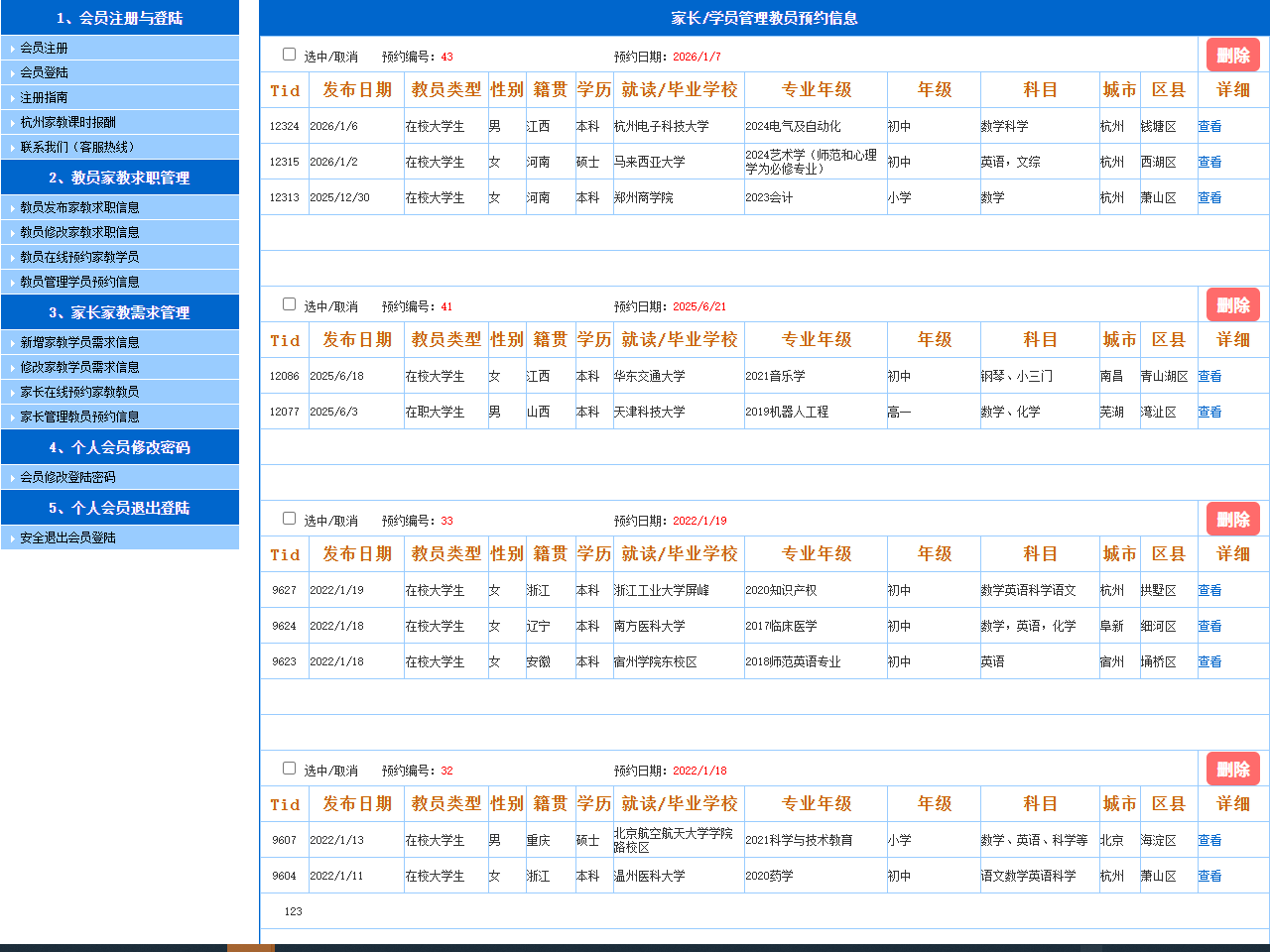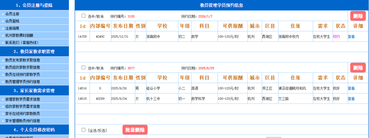 请点击左侧链接【家长管理教员预约信息】,可自行查看历史预约记录,以及删除与批量删除管理.