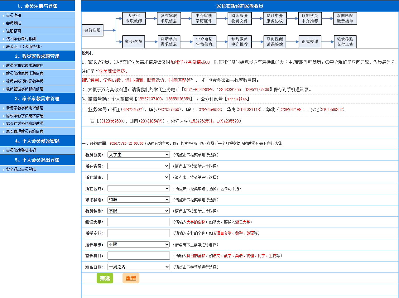 请点击左侧链接 【家长在线预约家教教员】链接,可自行搜索预约教员,也可在最近一个月新教员列表里自行选择.