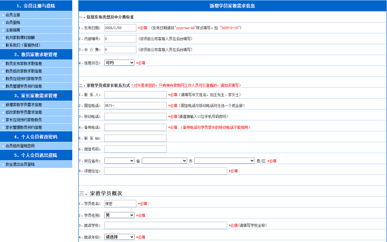 家长或学员本人想找家教教员,请点击左侧【新增家教学员需求信息】链接,跳出如下表单;按照提示说明,请在30分钟之内详细填写好学员家教需求信息,并点击 【提交】按钮。若有多个不同的家教需求,请继续刚才的操作即可。