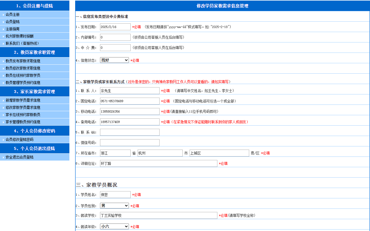 在没退出登陆前,若认为自己发布的学员家教需求信息要进一步修改补充完善,请点击左侧【修改家教学员需求信息】链接;选择要修改的学员 信息,修改后点击 【提交】按钮。 若已退出登陆,只需到网站右上角点击 【登陆】按钮,再按照上面的说明发布或修改学员需求信息。