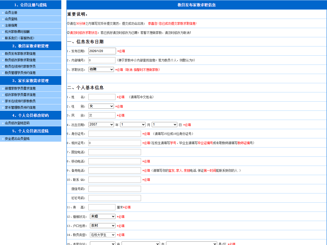 在校大学生、在职大学生、在职教师、退休教师等想做家教带家教学生的,请点击左侧【教员发布家教求职信息】链接;跳出如下表单,按照提示说明,请在30分钟之内详细填写好家教求职简历信息,并点击 【提交】按钮。
